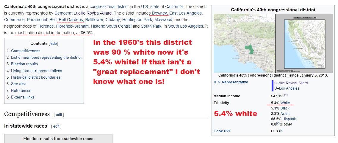 I went to two junior high schools in LA County. Downey and Bell Gardens when I went to those schools they were 90% white that was in 1965 1996. Now Bell Gardens Junior high is 3% white and I don't know about Downey. Both of these cities are in the 40th district CA which is 5 % white